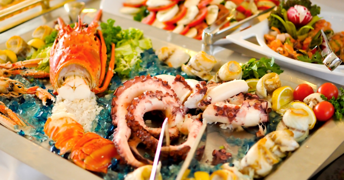 Grilled Salmon Or Freshly Toasted Halibut Au Gratin Potatoes Snow Peas and Baby Carrots Caesar Salad Vegetable Pasta Salad Rolls and Butter