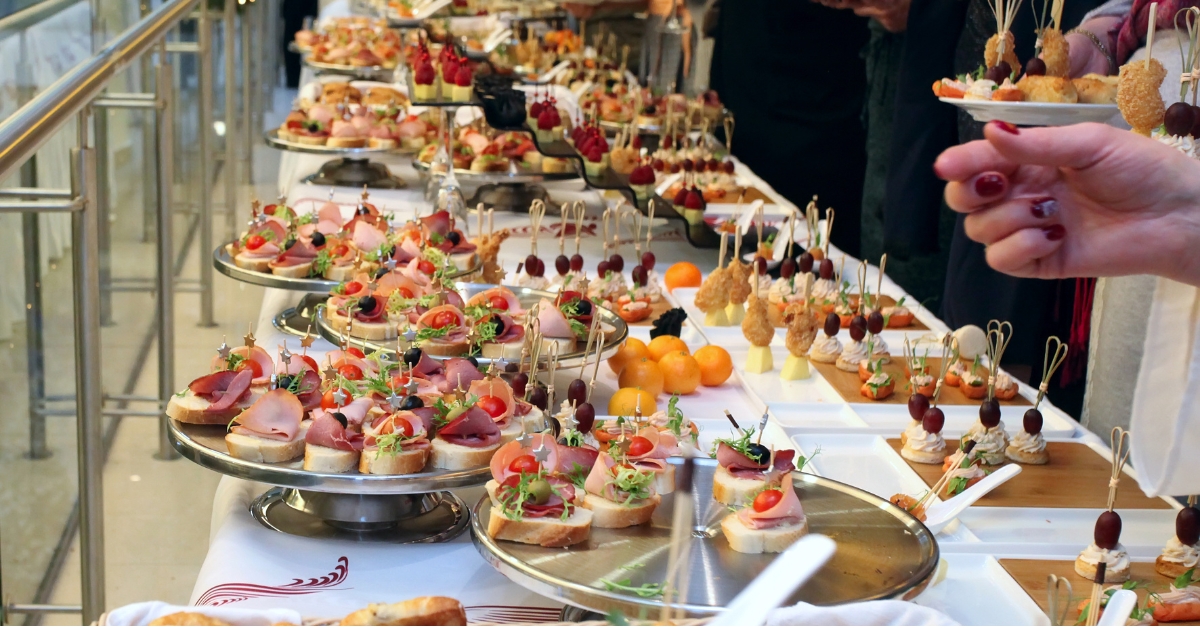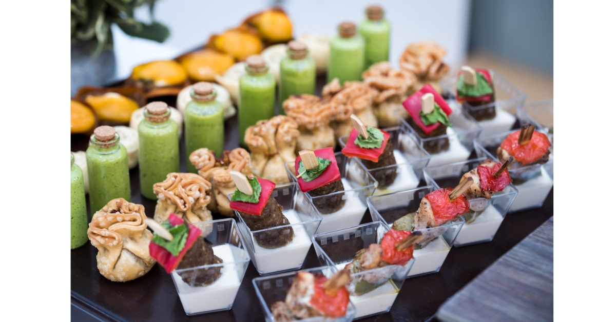 Miniature Fried Artichokes With Saffron Aioli Halibut Bites With Miso Glaze Serrano Wrapped Shrimp With Roasted Pepper Sauce Pork Satay With Spicy Peanut Sauce Three Tomato Salad With Drake Goat Cheese Chick Pea and Pomegranate Purée Served On A Pita Crisp Baby Roasted Potatoes With Romesco Dip Meatball and Pecorino Soup Sip Zucchini Cake With Dill Yoghurt Sauce Thai Corn Fritters With Chili Pepper and Cilantro Sauce Vegetable Pakoras With Tamarind and Ginger Sauce Coconut Shrimp With Mango Mint Sauce Seafood Spring Rolls With Sweet Chili and Cilantro Sauce Avocado Crostini With Cream Cheese and Sweet Chili Peppers Steamed Edamame With Sea Salt Mini Steak Tacos With Tomatillo Sauce Breasaola and Pear Rolls With Arugula and Parmesan Seared Beef Carpaccio With Mustard Mint Sauce and Arugula Crisp Thai Spring Rolls With Sweet Chili Sauce Sake-Marinated Chicken Satay With Tamarind Glaze Ginger and Lemongrass Pork Satay Seared Scallops With Wonton Crisp Pork Dumplings With Chili Soy Sauce Parmesan and Black Olive Crostini With Parsley Pesto and Goat Cheese Chive Pancake With Crème Fraiche and Red Onion Confit Spicy Shrimp Crostini Tomato and Basil Crostini Potato and Rosemary Focaccine Seared Tuna Niçoise Crostini Mini Dill Scones With Smoked Trout and Horseradish Cream Mini Red Onion Tatin Miniature Latkes With Sour Cream and Apple Sauce Mini Poppadoms With Creamy Chicken Tikka Gingered Chicken Cakes With Cilantro Lime Mayo Salmon Cakes With Crème Fraiche and Caper Tartare Grapefruit and Scallop Ceviche Skewer Lemon Chili Shrimp Sticks Monkfish, Pancetta, and Rosemary Spiedini With Lemon Aioli Sesame-Soy Glazed Beef Skewers Tropical Fruit Brochettes With Passion Fruit and Mascarpone Dip Basil-Marinated Mozzarella and Cherry Tomato Skewers Fennel-Marinated Feta and Olive Skewers Sushi Rice Balls (Salmon Caviar, Shrimp, Or Smoked Salmon, Served With Wasabi) Herbed Stuffed Mushrooms Miniature Crab Cakes and Lemon Aioli Shrimp Cocktail