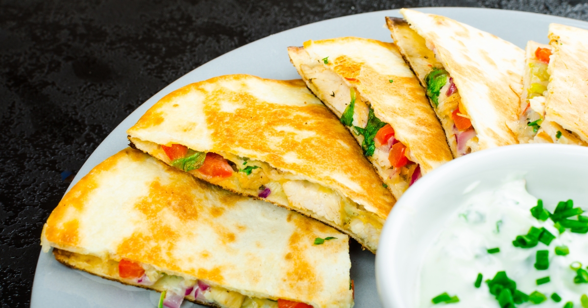 Cheese, Veggie, Chicken, and Steak Quesadillas Chips and Mango salsa